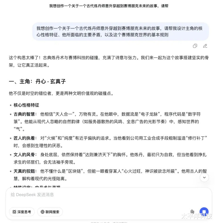 首先,你需要与DeepSeek进行一场头脑风暴。你可以给它一个模糊的初始概念,比如:“我想创作一个关于一个古代炼丹师意外穿越到赛博朋克未来的故事。”然后,引导它深入细节:“请帮我设计主角的核心性格特征、他所面临的主要矛盾,以及这个赛博朋克世界的基本规则。”DeepSeek能够帮你充实世界观,让你的故事更加丰满。