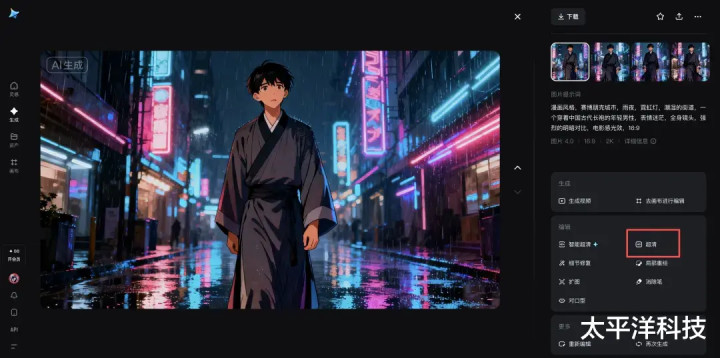 在漫画创作中,保持角色形象的统一性是最大的挑战之一。当你生成了满意的主角形象后,选择生成超清图像并保存为参考图。在后续的图像生成中,导入保存好的参考图,可以确保主角在不同画面中拥有一致的面部特征和服装风格,这是让你的漫画看起来专业且可信的基础。