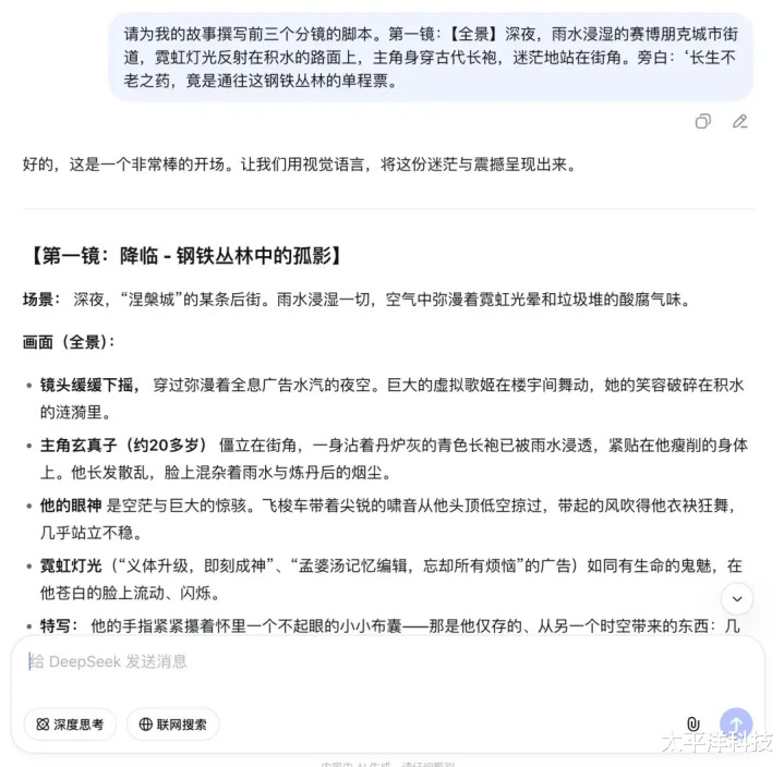 例如,你可以这样对DeepSeek说:“请为我的故事撰写前三个分镜的脚本。第一镜:【全景】深夜,雨水浸湿的赛博朋克城市街道,霓虹灯光反射在积水的路面上,主角身穿古代长袍,迷茫地站在街角。旁白:长生不老之药,竟是通往这钢铁丛林的单程票……”通过这种方式,你可以快速生成整部漫画的文字基础。