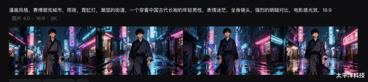 以上面的脚本为例,你在即梦中输入的提示词可以是:“漫画风格,赛博朋克城市,雨夜,霓虹灯,潮湿的街道,一个穿着中国古代长袍的年轻男性,表情迷茫,全身镜头,强烈的明暗对比,电影感光效,16:9”